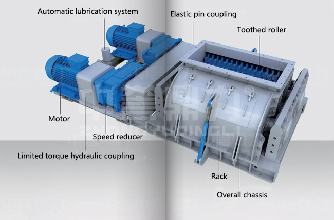 The Zhongyu Dingli DLGPX double roll crusher consists of a frame, toothed rollers, elastic column pin coupling, automatic lubrication system, motor, reducer, limited torque hydraulic coupling, integral chassis and other components.