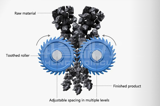 The double roll crusher crushes materials through a comprehensive process of shearing, squeezing, and stretching. After the material enters the gap between the two toothed rollers, it is subjected to the squeezing and shearing forces of the relative rotation of the two toothed rollers, and is crushed into the required particle size under squeezing, shearing, and grinding.